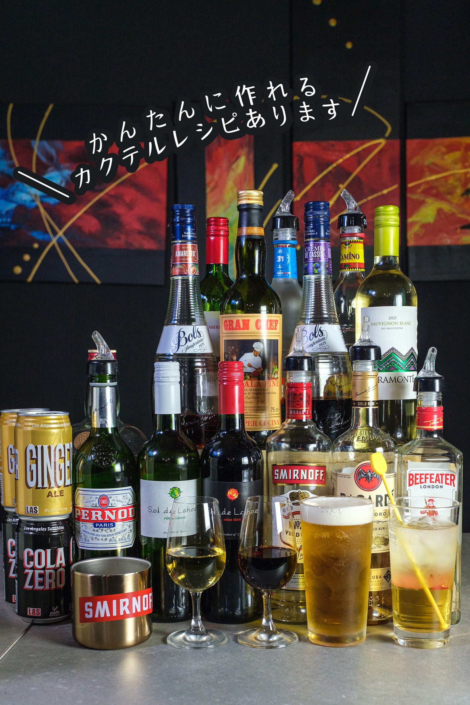 生ビール(ハートランド) / 樽詰ハイボール(ホワイトホース) / サワー各種(レモン・グレープフルーツ・ゆず・巨峰・青りんご・シークワーサー) / ジムビーム(バーボン) / デュワーズホワイトラベル(スコッチ) / ラム / テキーラ / ウォッカ / ジン / ワイン(赤・白) / 焼酎(芋・麦) / 梅酒 / 日本酒 / ソフトドリンク(コーラ・ジンジャーエール・ウ−ロン茶・オレンジ・グレープフルーツ・カルピス)